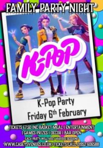 Due to popular demands of this theme we are expecting a sell out. Tickets include a basket meal and the night includes games music prizes and our team will be k pop style characters for kids to have photos with. Singalong dance along etc etc